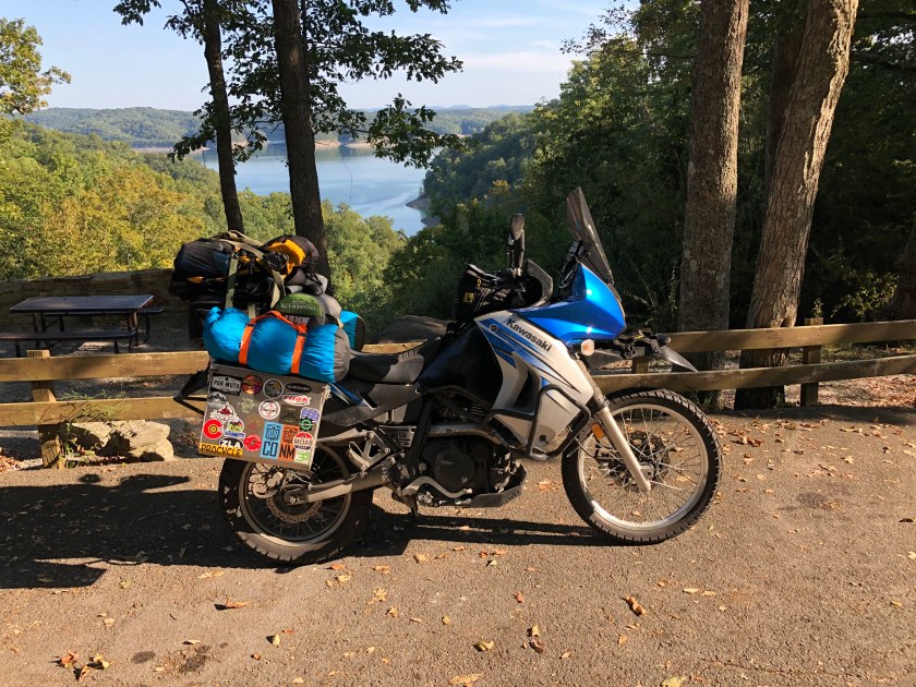 Roughly an hour later I pulled into Lake Cumberland State Park which was pretty much deserted since it was after Labor Day weekend. Normally, this state park is slammed with campers and boats during the summer months. I pretty much had the run of the park and set up camp in no time before settling down for some campfire cooking. That night I went through my Butler maps of Southern Appalachia and my map of Kentucky and developed a route that would take me into Tennessee via the Cumberland Gap. The next day the KLR and I were going to push through mountainous terrain which is something we haven’t done in almost three years.