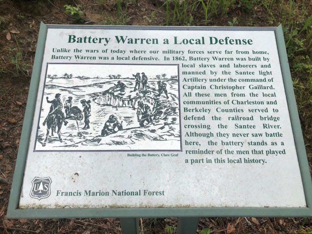 Battery Warren was built to house five artillery cannons and defend a railroad bridge that crossed the Santee River. This fortification never fired a shot in anger and the expected ground assault on Charleston never came and the city surrendered in March of 1865. Overtime many of the fortifications were demolished as Charleston grew into one of the biggest cities in the South Atlantic region. Despite urban sprawl and modernization Battery Warren was somewhat forgotten. It wasn’t until 1936 when the National Forest Service started to protect and manage the massive coastal forest east of Charleston and named it after the local Revolutionary War Hero, Francis Marion. Inside Francis Marion National Forest is over 258,000 acres of dense coastal pine tree’s and conifers as well as some forgotten historic locations such as Battery Warren.
