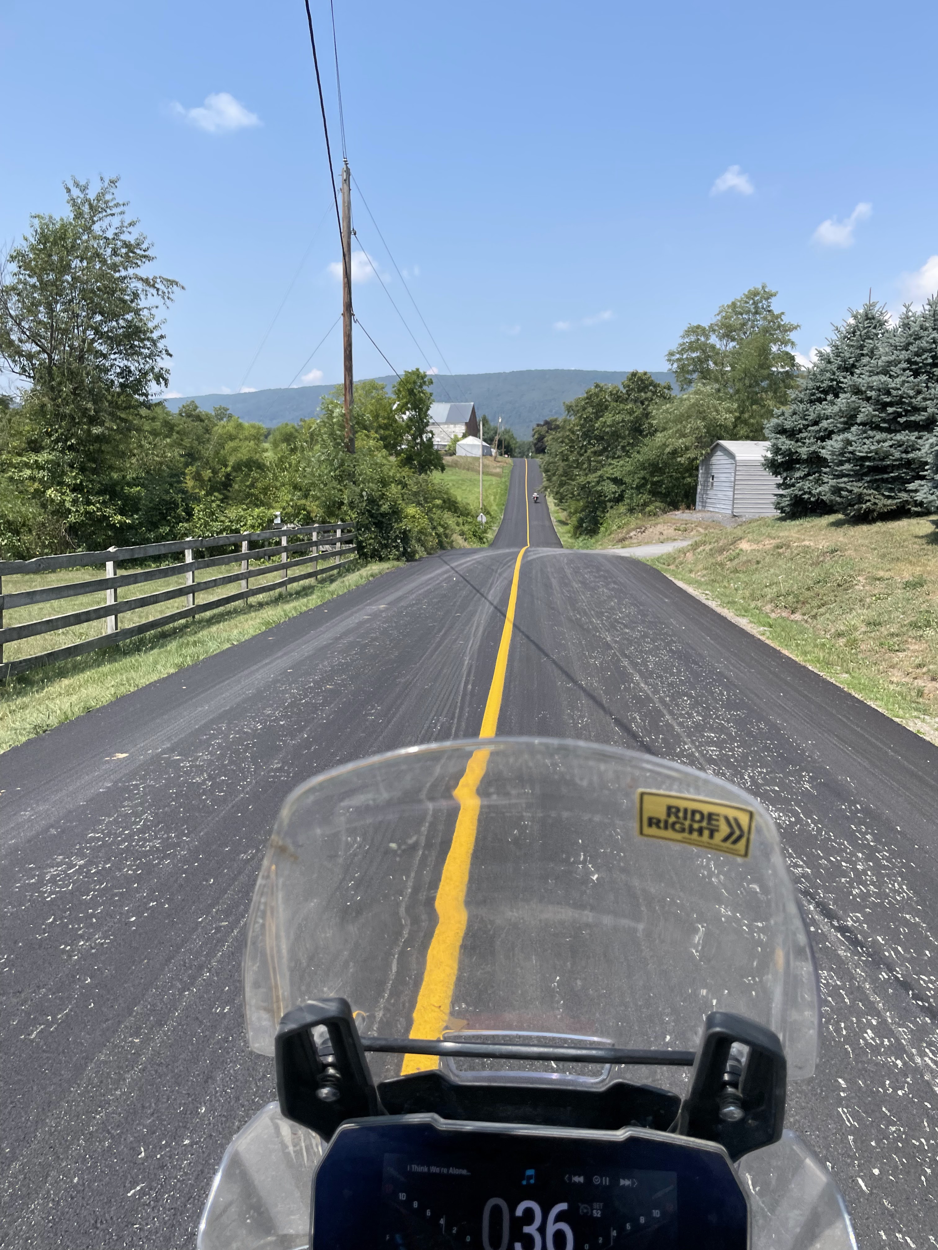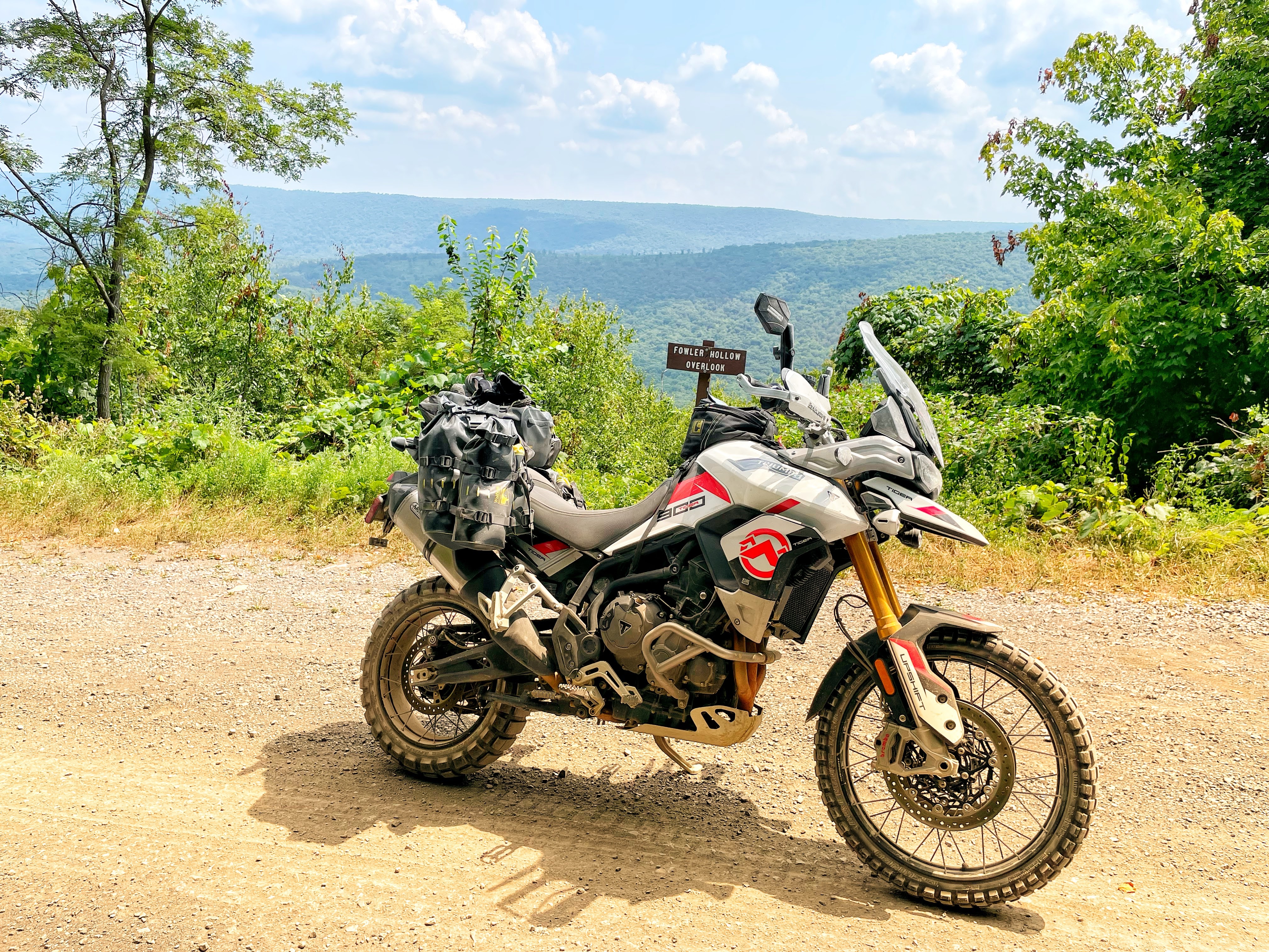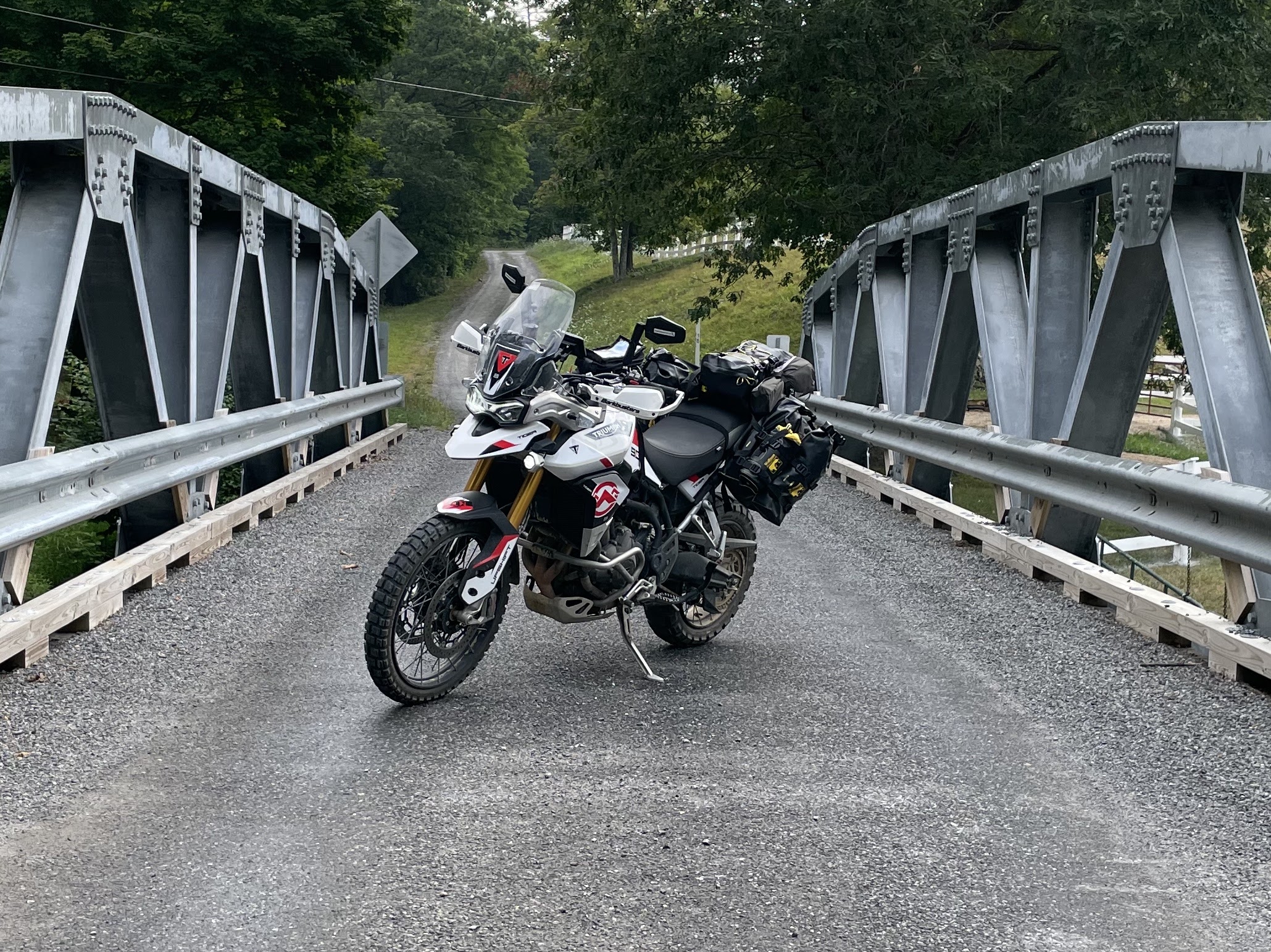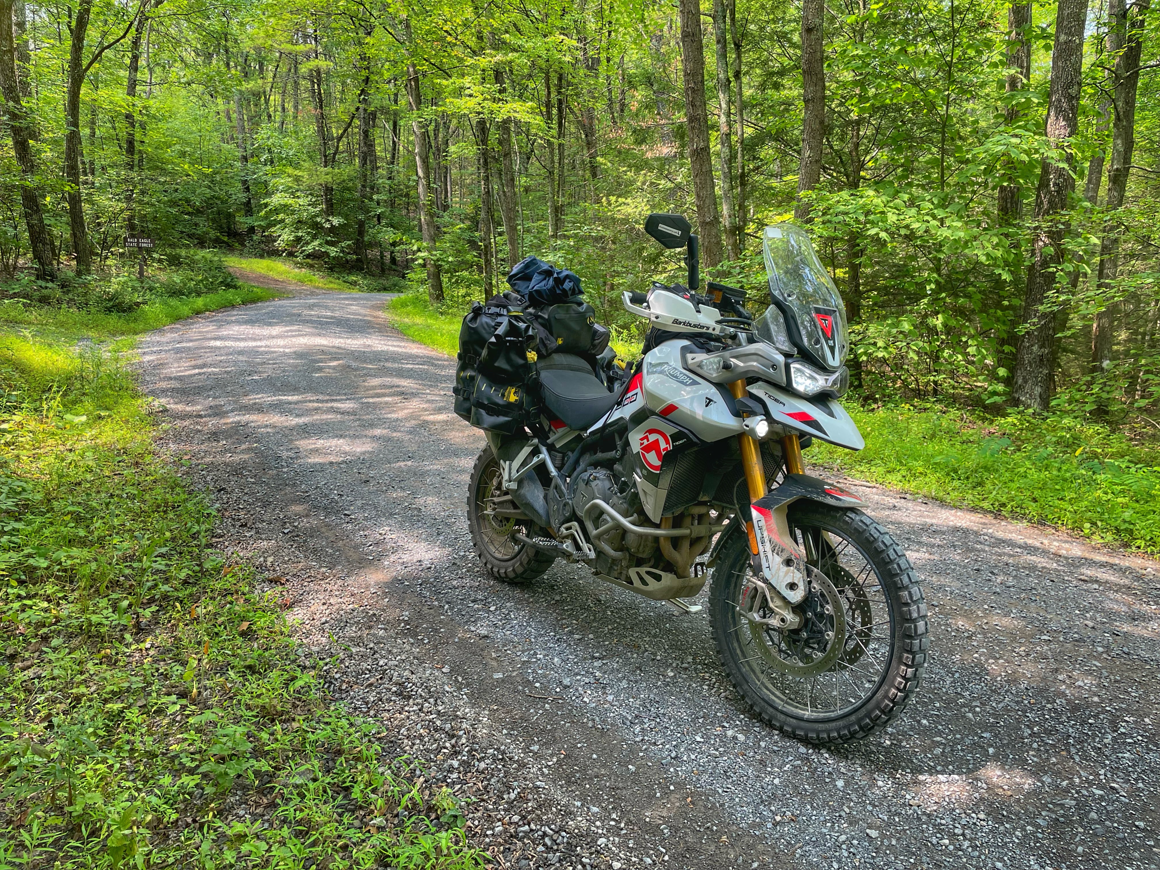 Towards the end of section 6 near McVeytown, Pennsylvania I picked up a large piece of flint that pierced a knob on my rear tire. Since the Tiger has tubeless tires I was able to plug it however, I didn’t feel entirely comfortable with the tire plug that I put in it. With daylight fading we made the decision to push towards the town of State College and stop at Best Line Powersports to see if they could patch my rear tire or even replace it. The guys at Best Line went above and beyond by staying late and installed a heavy duty plug in my tire. Sensing that it was almost dark they also recommended a near by hotel and pizza restaurant for us to unwind which was greatly appreciated. With 230 miles to go we would be entering an area with some of the most technical riding on the MABDR and we would also contend with something that we previously didn’t deal with, the weather.